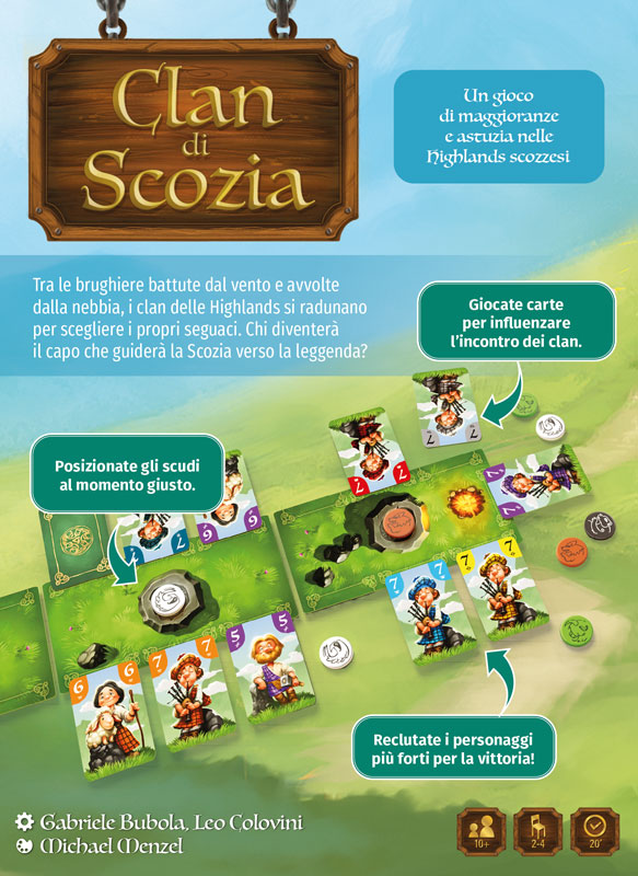 In Clan di Scozia piazzi carte in base a colore o valore e usi con astuzia i tuoi segnalini clan per ottenere i seguaci migliori. Ogni mossa può cambiare l’esito finale: tempismo, lettura del gioco e strategia sono le chiavi per portare il tuo clan alla vittoria!