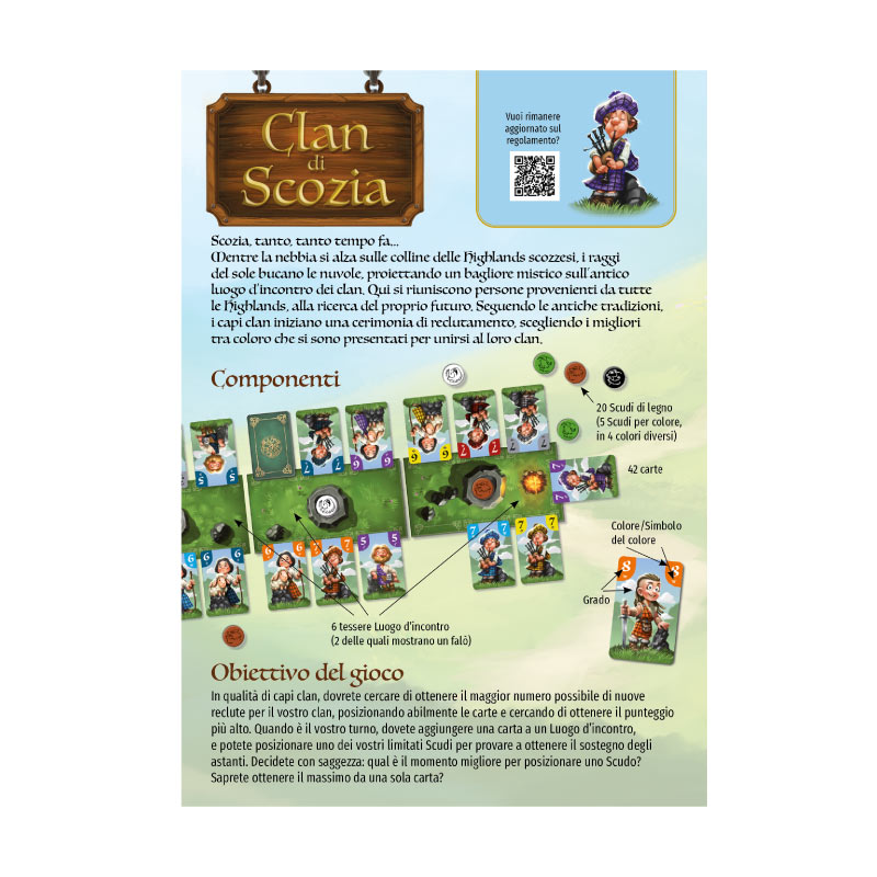 In Clan di Scozia, ti ritrovi nelle misteriose e affascinanti Highlands scozzesi, dove i popoli liberi si radunano per un’antica cerimonia di unione ai clan. Ogni giocatore veste i panni di un capo clan, pronto a conquistare onore e prestigio raccogliendo i seguaci migliori. L’atmosfera è carica di tensione e tradizione: chi saprà muoversi con astuzia emergerà come guida incontrastata.
