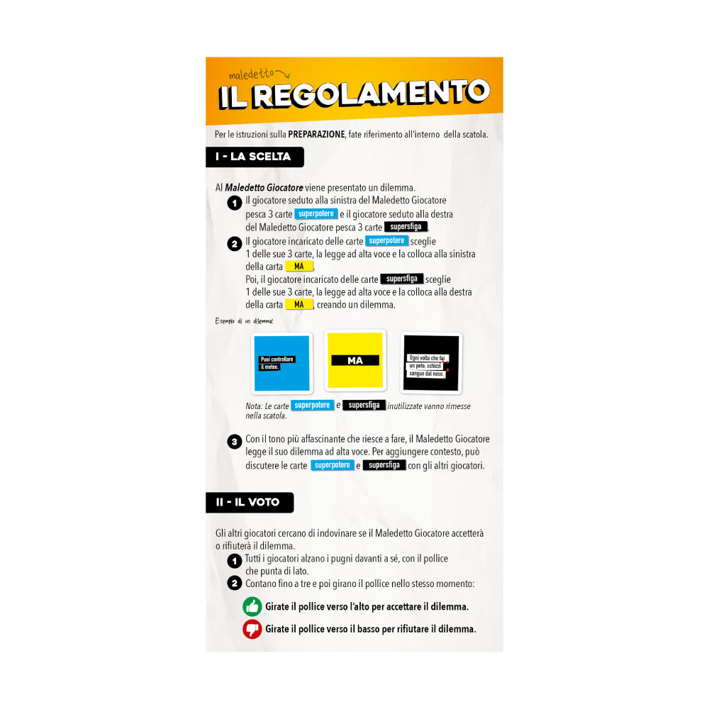 Un giocatore sceglie il superpotere, un altro la supersfiga. Fate punti e ottenete la vittoria indovinando correttamente se il giocatore accetterà o rifiuterà il dilemma proposto! Vorreste poter viaggiare avanti o indietro nel tempo di 100 anni, pur facendo passare un mese ogni volta che starnutite?