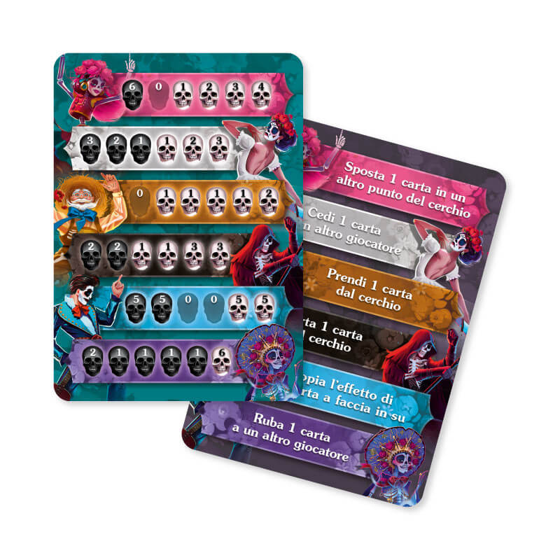Il cuore del gioco è un cerchio di carte coperte da cui, a turno, i giocatori ne rivelano una, attivano effetti speciali e raccolgono carte. Se le carte accanto sono dello stesso colore, si scatenano reazioni a catena che possono ribaltare la partita. Ogni carta porta con sé teschi chiari o scuri: i primi valgono punti, i secondi li fanno perdere. Ogni scelta può essere un piccolo colpo di fortuna… o una mossa calcolata con astuzia.