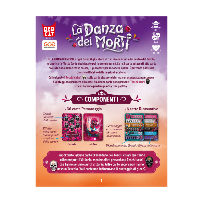 La Danza dei Morti si distingue per il suo ritmo serrato e per la capacità di sorprendere a ogni turno. Con regole immediate e una forte componente di interazione, offre partite veloci ma sempre diverse, piene di effetti imprevedibili e scelte divertenti. Perfetto per chi cerca un gioco brillante, coinvolgente e capace di mettere tutti al tavolo nello spirito della festa.