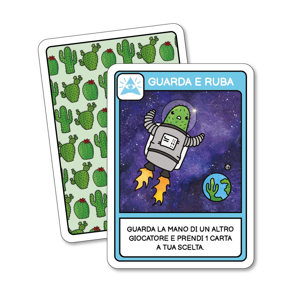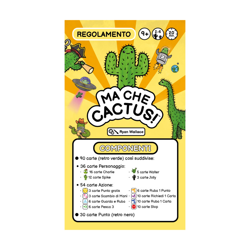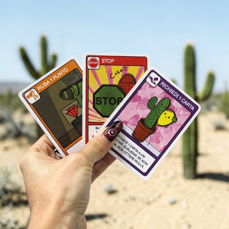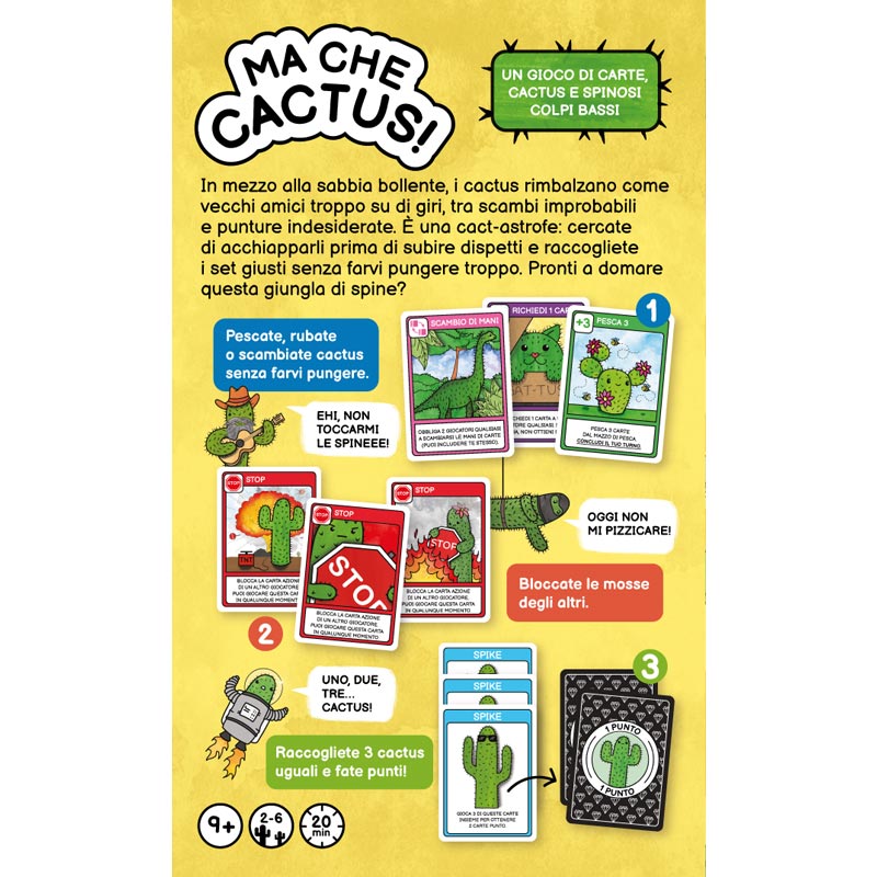 In Ma che cactus? l’obiettivo è semplice: accumulare set di cactus per fare punti. Il problema? I tuoi avversari faranno di tutto per rovinarti il giardino. Tra carte Azione che permettono di spiare le mani altrui, rubare cactus senza sensi di colpa e bloccare mosse sul più bello, ogni partita diventa una gara di furbizia, faccia tosta e piccoli tradimenti botanici. Facile da imparare, veloce da intavolare e pericolosamente rigiocabile.